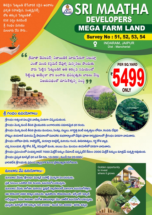 Welcome to Sri Maatha Mega Farm Land Phase–2, a prestigious eco–investment project by Sri Maatha Developers, offering premium farmland plots surrounded by nature. Strategically located at Tekumatla, Jaipur, District Mancherial, this venture is designed to provide sustainable income and long-term value growth through timber and bamboo plantations. It’s not just land—it’s an opportunity to grow your wealth while contributing to a greener planet.